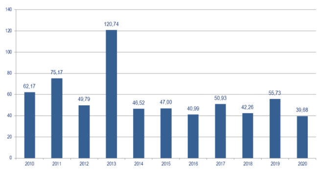 В России по итогам 2020 г. произошло падение рынка M&A почти на 29 % в денежном выражении – с 55,73 млрд $ до 39,68 млрд $. При этом количество сделок увеличилось с 421 в 2019 г. до 466 в 2020 г. Падение объясняют пандемией коронавируса и возникшими с ней экономическими рисками, когда предприятия временно отказались от планов кого-то купить или присоединить, а сосредоточили ресурсы на развитии существующих активов.