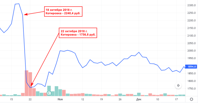 18 октября 2018 г. прошел слух о покупке 30 % доли в Яндексе Сбербанком. Котировки первого за 4 дня рухнули примерно на 22 %. Инвесторы негативно восприняли информацию о возможном росте государственного регулирования в IT-сфере.