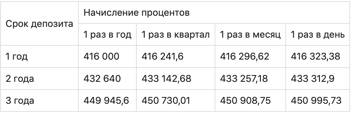 Сравним полученный доход по депозиту с начислением процентов ежегодно, ежеквартально, ежемесячно и ежедневно.