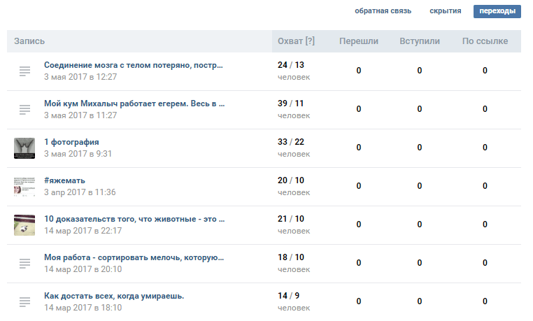 Анализ эффективности можно провести прямо в Вк. У личных страниц, групп и пабликов есть раздел «Статистика». Там показан охват пользователей — число людей, которые увидели записи на стене группы или в новостной ленте, а также характеристики ЦА. Также можно просмотреть статистику по каждой записи, и в дальнейшем не публиковать посты, которые набирают мало просмотров и лайков.