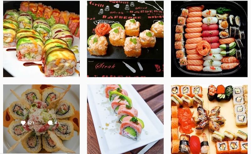 Аккаунт сервиса, предлагающего доставку суши: все красиво, ярко, аппетитно