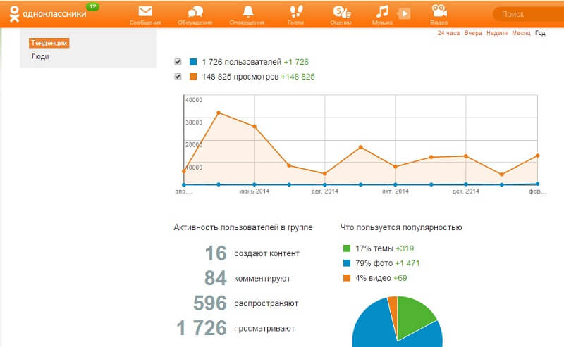 Статистика в Одноклассниках показывает охват, активность, какие типы контента пользуются популярностью и многие другие параметры — все, что нужно для первичного анализа. Статистика находится в группе, в отдельном меню.