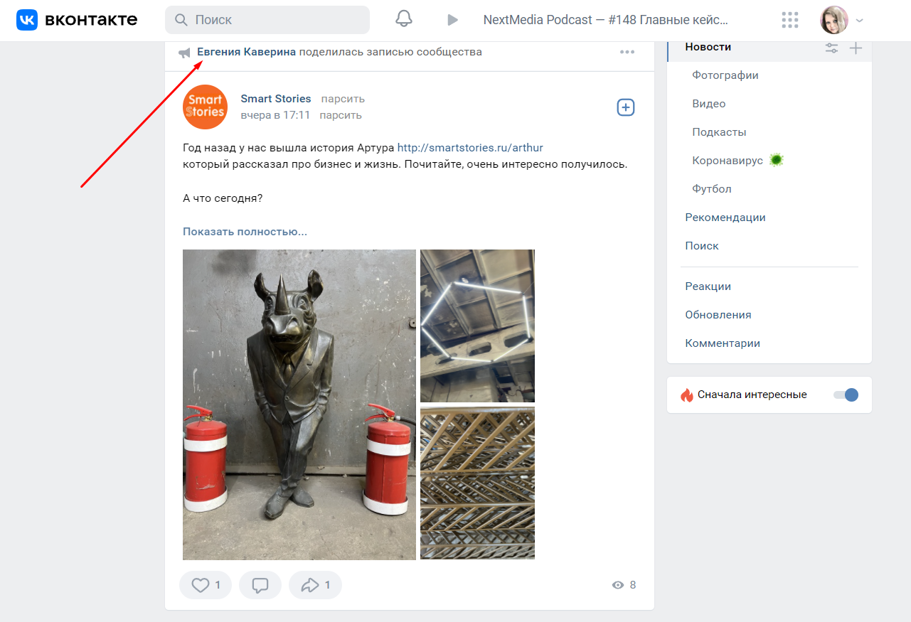 - Записи с хорошими социальными доказательствами, которые лайкнули, репостнули и прокомментировали его друзья.