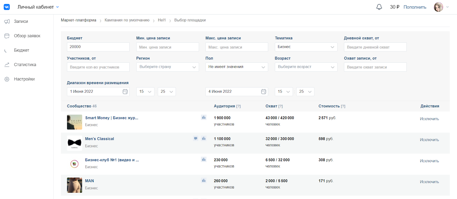 Искать сообщества для посевов удобно через маркет-платформу ВКонтакте, которая сама подберет площадки по заданным критериям: бюджету, тематике, охвату, социально-демографическим характеристикам подписчиков.