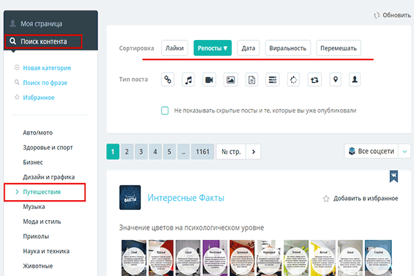Далее выберите интересующую вас тематику, по которой нужно отсортировать посты. Все посты в категории также можно отсортировать по популярности: лайкам, репостам и по типу: аудио, видео, картинки, документы, опросы.