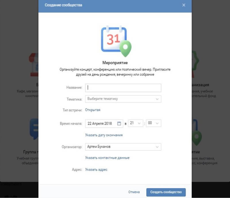 Если это событие от определенной организации, у которой есть своя группа, или от вашего сообщества, то целесообразнее поставить их. Это позволит аудитории понять, что событие проводится в рамках той или иной деятельности. В случае со встречей одноклассников можно поставить организатором и себя.
