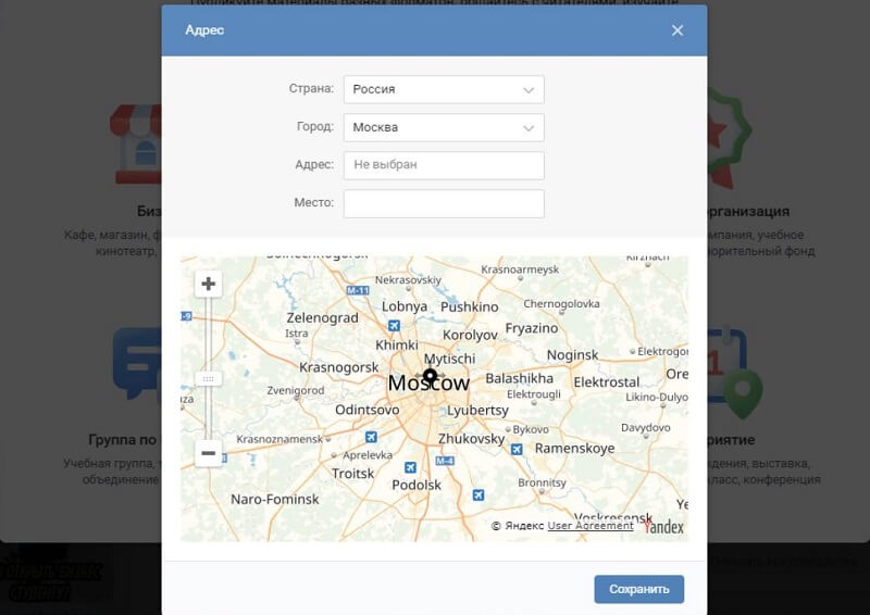- Адрес. Нажав на кнопку «Указать адрес», вы увидите новой окошко с указанием страны, города, адреса и места проведения мероприятия.