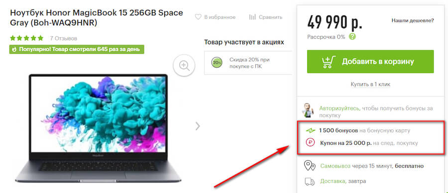Пример — магазин Эльдорадо. Справа от товара на сайте указано, сколько бонусов можно получить при его покупке. Бонусами можно оплатить до 50% стоимости следующей покупки, один бонус равен 1 рублю. Кроме бонусных рублей Эльдорадо предлагает скидочные купоны, которыми можно оплатить до 25% стоимости акционных товаров в период проведения акции (купоны действуют в течение ограниченного времени).