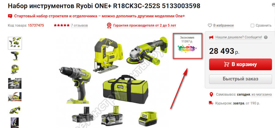 Например, магазин инструментов предлагает стартовый набор строителя и отделочника за 28 493 рублей. В нем 7 предметов, покупая набор, можно сэкономить 11 397 рублей, чем если покупать все 7 предметов по-отдельности.