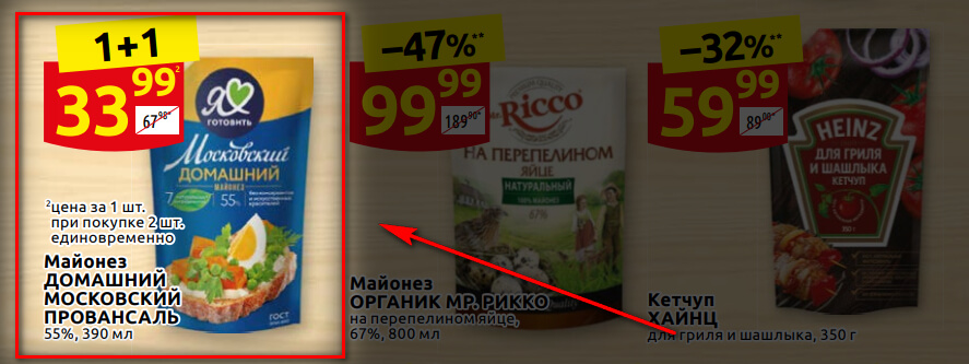 Этим приемом постоянно пользуются в супермаркетах. Пример — магазин Дикси, если купить 2 пачки майонеза, то они будут стоить по 33.99 рублей каждая, а если одну, то только одна обойдется в 67.98 рублей. Конечно, покупателю выгоднее брать сразу две.