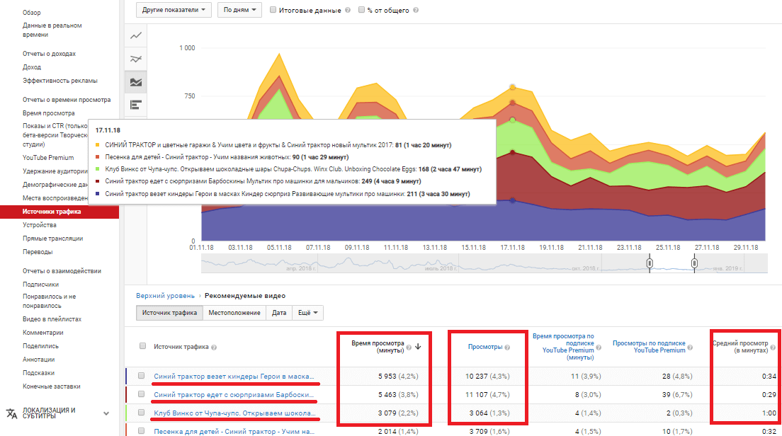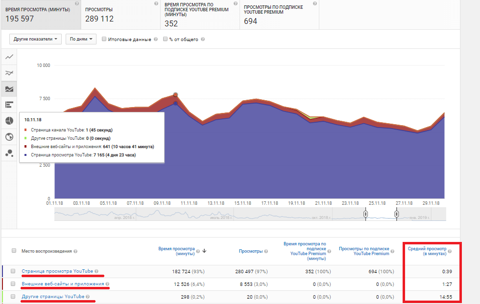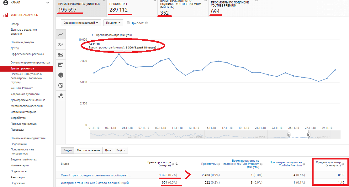 В самом верху перед графиками вы можете увидеть общую информацию по статистике за указанный период. Если навести на пик, то появится дата, время просмотра в минутах и днях. Под графиками вы найдёте информацию о своих роликах, отсортированных по количеству просмотров. там же в последней графе указано среднее время просмотра.