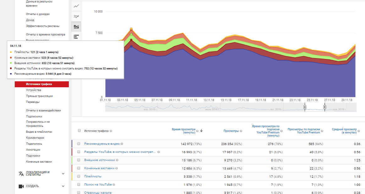 Аналогичными способами вы можете проверить как часто переходят по вашим плейлистам, с помощью каких ключевых слов находятся ваши ролики, а также с каких каналов были переходы. Вы можете отследить статистику, сколько переходов было по подсказкам и оповещениям.