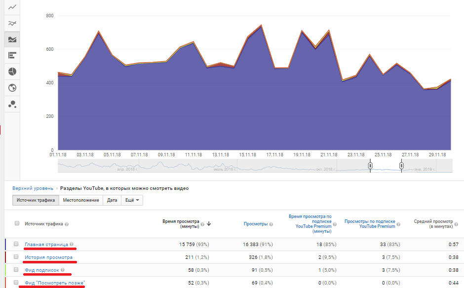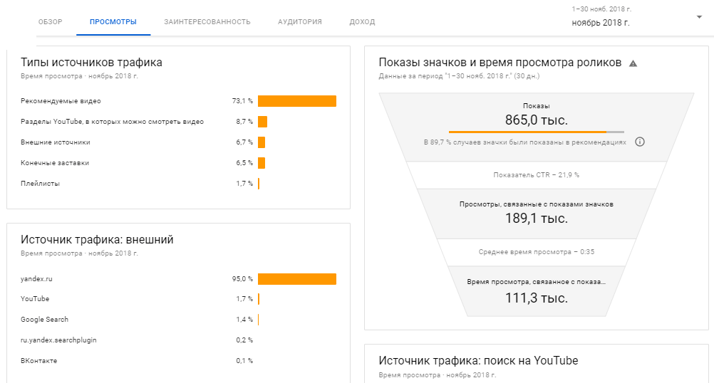 Из этого раздела вы сможете понять, какой из источников трафика наиболее эффективный и будете делать на него упор при развитии. А на те, которые не приносят просмотров, не стоит тратить своё время.