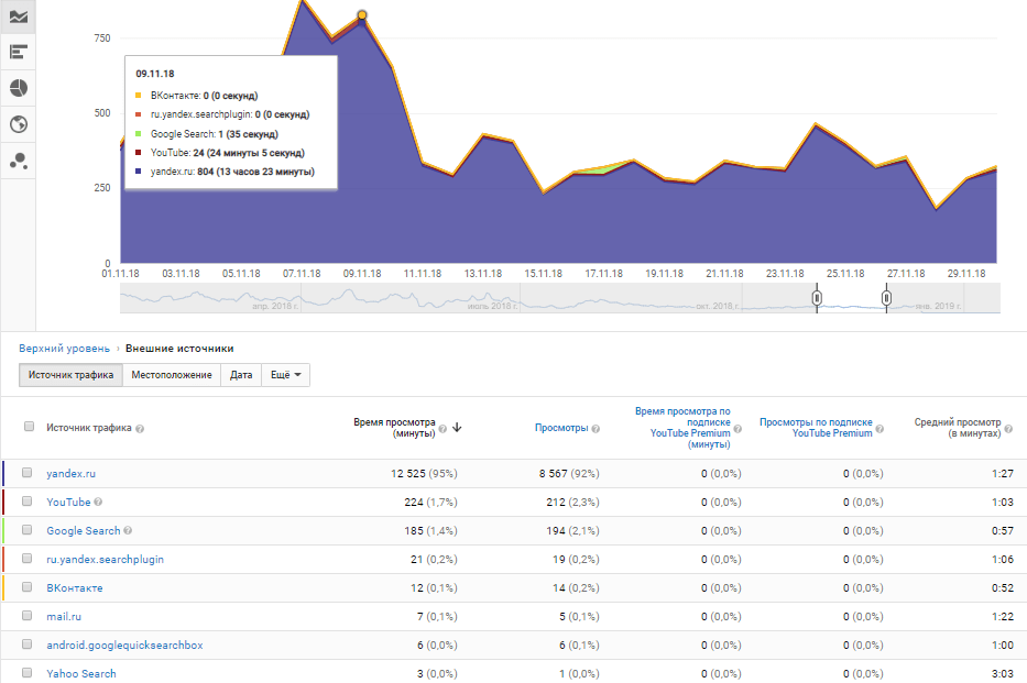 В следующей вкладке «Внешние источники» указано, где помимо ютуба смотрят ваши ролики. Это может быть поисковая система Яндекс или Google, социальные сети и другие источники.