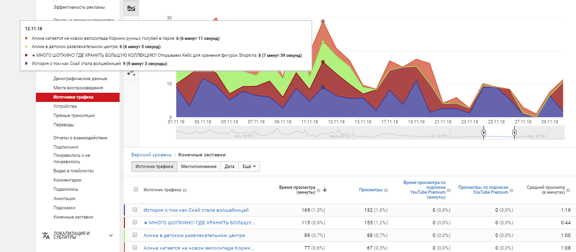 Из этой вкладки вы можете узнать, где люди больше всего смотрят ваши видео. На главном экране расположена разноцветная диаграмма, наводя на пики вы можете увидеть информацию по конкретному дню. Чуть ниже вы увидите места воспроизведения, количество и время просмотров, а также средний просмотр в минутах. Переходя на каждый источник трафика вы узнаете, в какой стране чаще смотрели ролики.