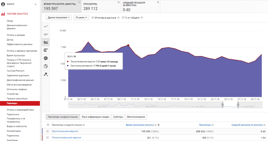 Многие пользователи Ютуба для продвижения указывают информацию о роликах не только на русском языке, но и заполнят функцию «Переводы». В этой вкладке вы можете посмотреть, сколько просмотров собрал ролик по поиску оригинального языка и перевода. На скриншоте видно, что дольше на роликах задерживаются зрители, которые находят ваш контент по иностранному языку.
