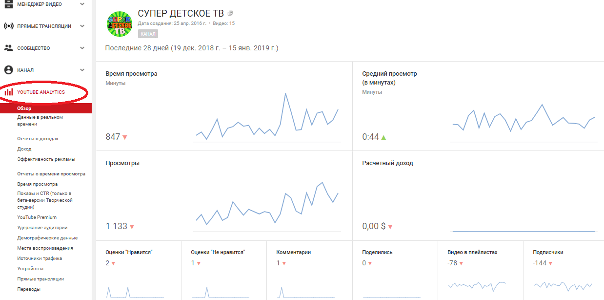 В этом разделе находится общая статистика YouTube канала. Количество и время просмотров, доход, топ-видео, оценки и комментарии к роликам, количество подписчиков, источника трафика, популярные регионы, пол зрителей и места воспроизведения.