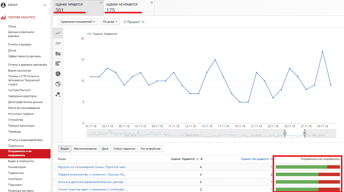 В отчёте вы увидите статистику по лайкам и дизлайкам. Сверху указана общая информация за указанный период. Снизу есть информация по каждому ролику и графическое изображение, которое наглядно показывает лайки — зелёный фон и дизлайки — красный фон.