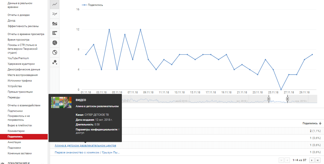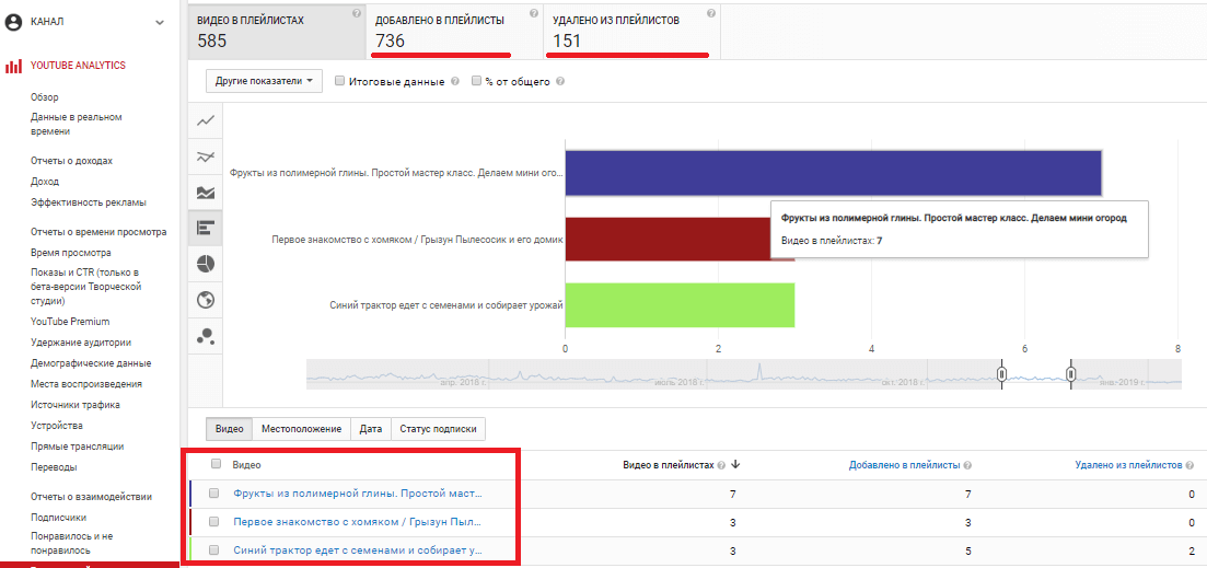На этой странице вы можете видеть, как часто пользователи добавляют ваши ролики в плейлисты или удаляют их. Под графиком есть цифровая информация о каждом ролике за указанный период.