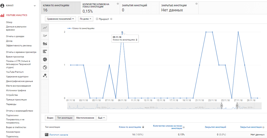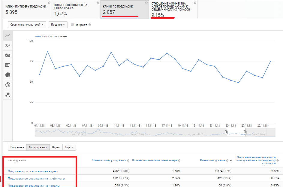 В этом отчёте можно увидеть эффективность подсказок-ссылок, которые появляются в правом верхнем углу при просмотре видео. Отчет позволяет увидеть число переходов, типа подсказок, анализ по видео и процентное соотношение кликов по общему числу показов.