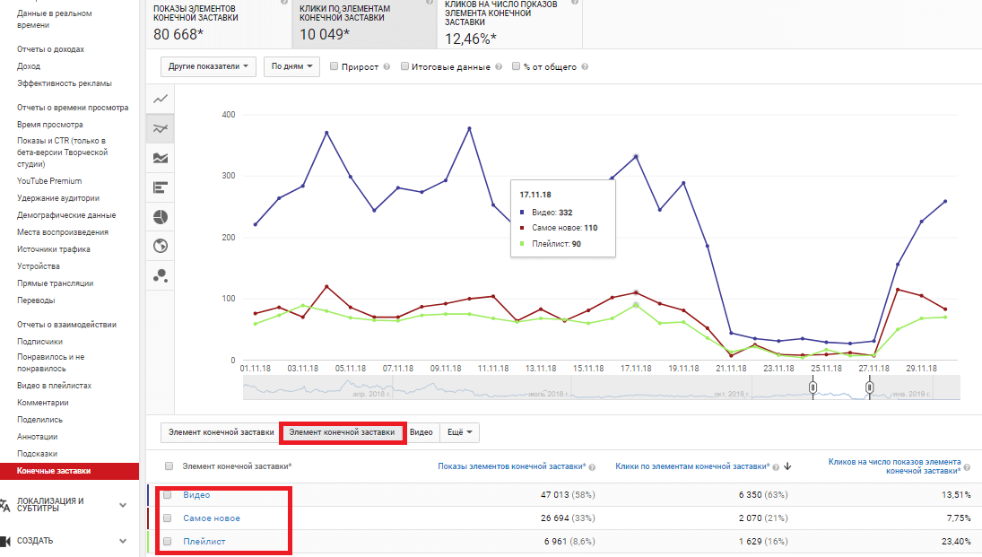 В конечных заставках вы можете ставить самое новое видео, любой ролик из выбранных или плейлист. В этом отчёте вы можете видеть статистику по элементам и конкретным видео.