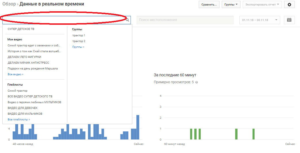 В этом отчёте можно отследить только данные просмотров за последний 48 часов и 60 минут. Автоматически показывается аналитика последних роликов, которые есть на канале. Но если вы хотите посмотреть статистику по одному видео выберите или напишите название в строке поиска.