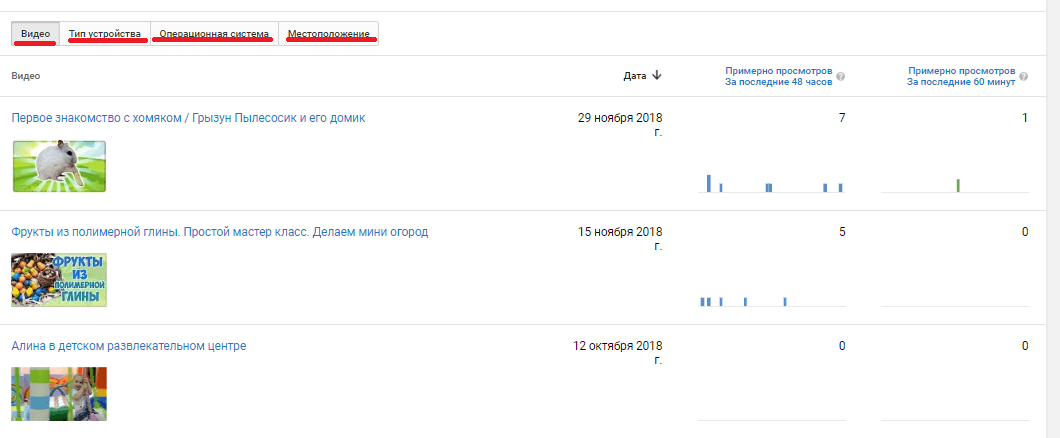 Если опуститься ниже графиков, то там в порядке добавления будут размещены последние ролики, рядом с которыми статистика за 60 минут и 48 часов. Нажав на кнопку «Тип устройства» вы сможете увидеть с какого устройства чаще просматривают ваш контент — планшетный ПК, мобильный телефон, компьютер, телевизор.
