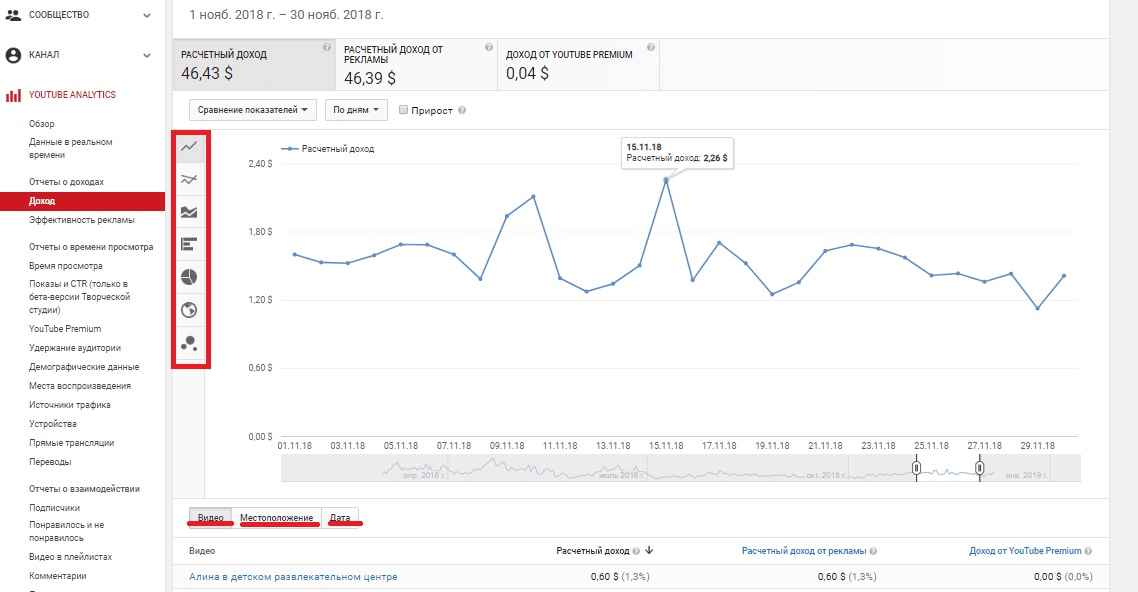 Ниже под таблицей есть вкладка «Видео», «Местоположение» и «Дата». Вы можете видеть статистику по каждому видео, по числу из указанного периода и расчетный доход, заработанный за просмотр рекламы в разных странах.
