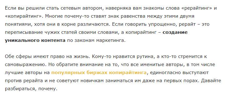 Обратите внимание на две вещи. Во-первых, во вступлении я объяснила суть темы и дала определение терминам. Я сразу же избавила человека от необходимости гуглить, что такое «копирайтинг» и «рерайтинг». Во-вторых, я намекнула, что читателя в основной части ждет кое-что интересное. Фраза «…все именитые авторы единогласно выступают против рерайта… Давайте разбираться, почему» невольно подталкивает к дальнейшему чтению. Эти приемы просты, но действенны. Попробуйте их применить.