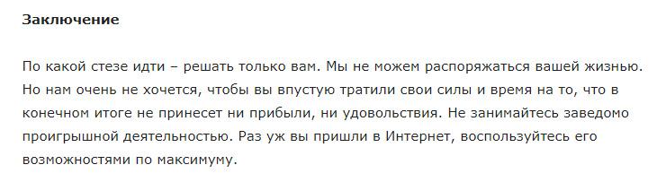 Многие авторы сливаются на финальной части по двум причинам: они слишком устают к концу текста и им кажется, что они уже сказали все, что только можно. И зря. Далеко не у всех людей есть силы, время и желание на изучение длинной статьи. Скорее, большинство зацепится за вступление, по диагонали пробежится по основной части, а потом перейдет к выводам. И вот их, как правило, читают очень вдумчиво.