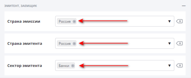 Шаг 2. В поле для эмитента выставляем страну эмиссии и эмитента – Россию. В поле для сектора выбираем “Банки”.