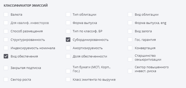 Шаг 4. Настраиваем колонки, которые мы хотим видеть в итоговой таблице. Ставим галочку в классификаторе эмиссии на “Субординированность”.