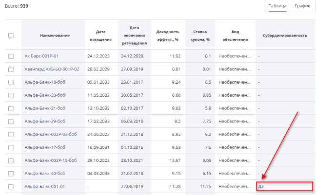Шаг 5. Просматриваем получившийся список и нахожу субординированные облигации. В соответствующей колонке будет стоять “Да”.