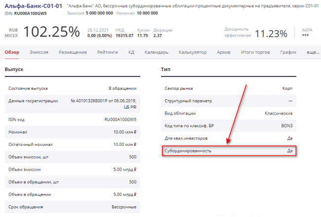 Например, субординированные облигации Альфа-Банк-С01-01 были размещены в июне 2019 г. Номинал бумаги равен 10 млн руб. Сегодня торгуются за 102,25 % от номинала, т. е за 10,225 млн руб. Купить могут только квалифицированные инвесторы.