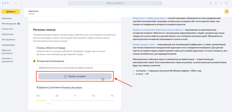 В блоке «Регионы показа» на уровне кампаний или групп выберите «Точное местоположение». Нажмите «Указать на карте».