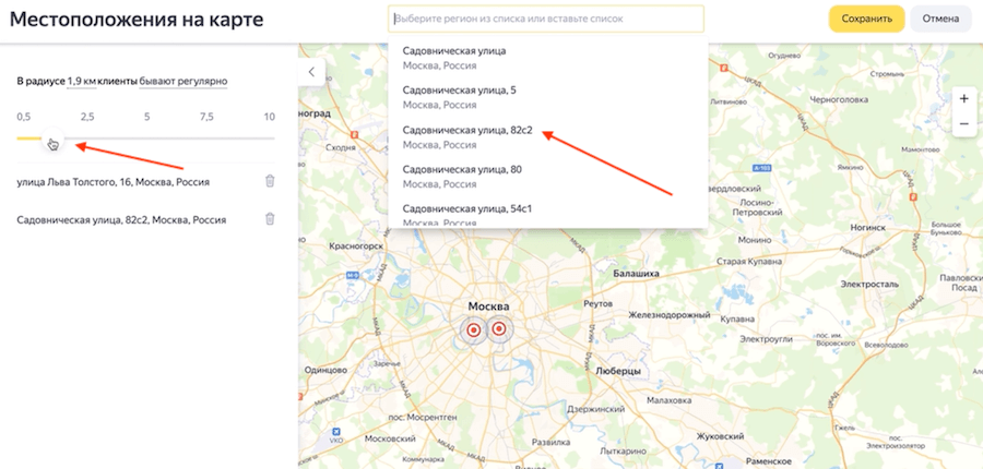 Укажите место и радиус, в котором будет показана ваша реклама. За раз можно задать не более 100 точек на карте.