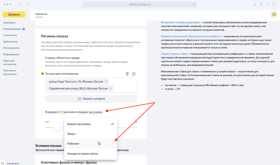 Выберите, кому именно вы бы хотели показывать рекламу: людям, которые бывают рядом в этом месте регулярно, живут, работают или находятся прямо сейчас.