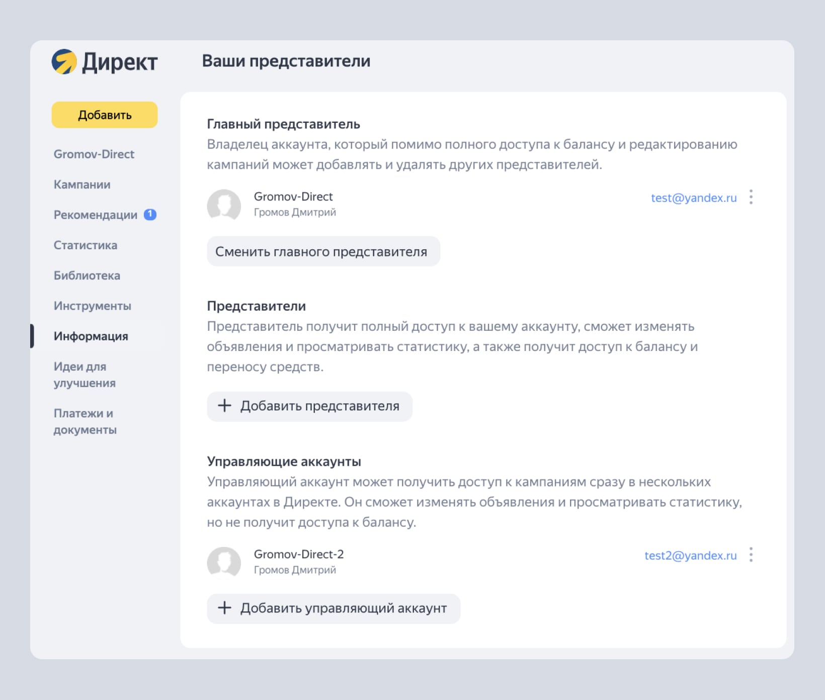 На странице «Ваши представители» в Яндекс.Директ появился новый тип доступа — «Управляющие аккаунты».