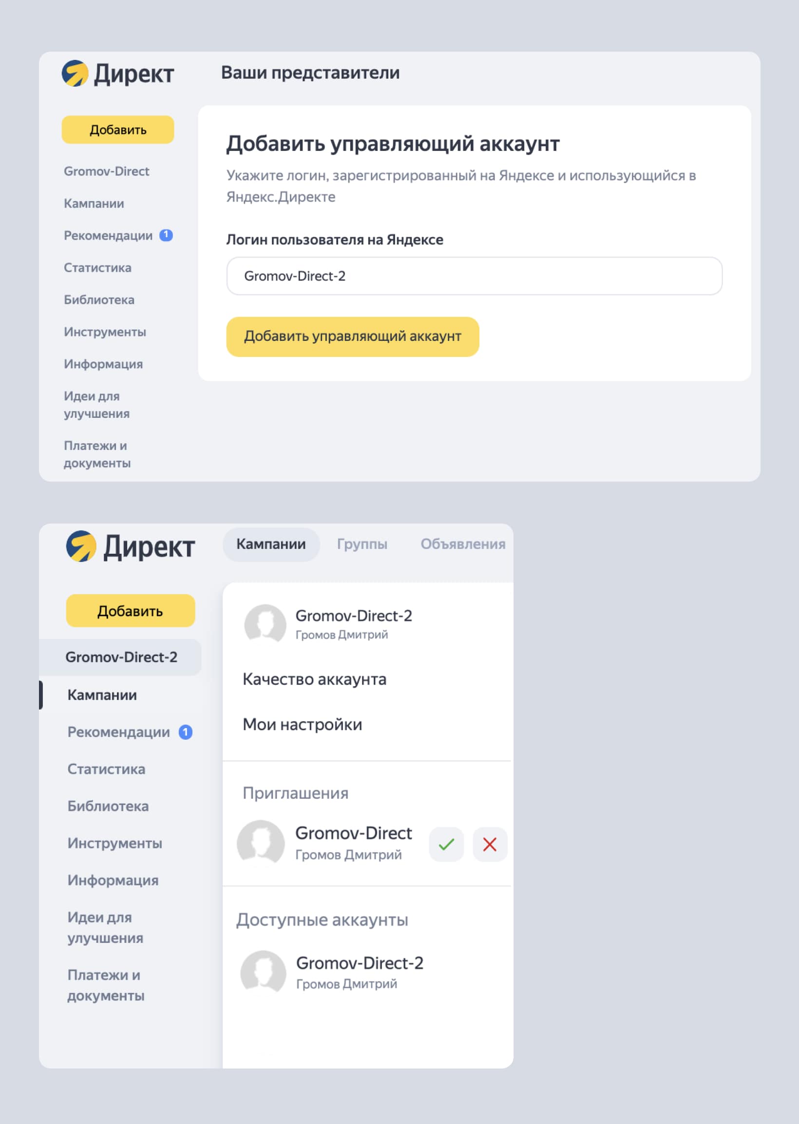 После того как логин назначен управляющим аккаунтом, он должен подтвердить приглашение в меню своего аккаунта. Приняв приглашение, он сможет переключаться между доступными аккаунтами в этом же меню и управлять их рекламными кампаниями. В управлении одного аккаунта может быть до 50 логинов. В любой момент можно отвязать как управляющий аккаунт, так и доступный.