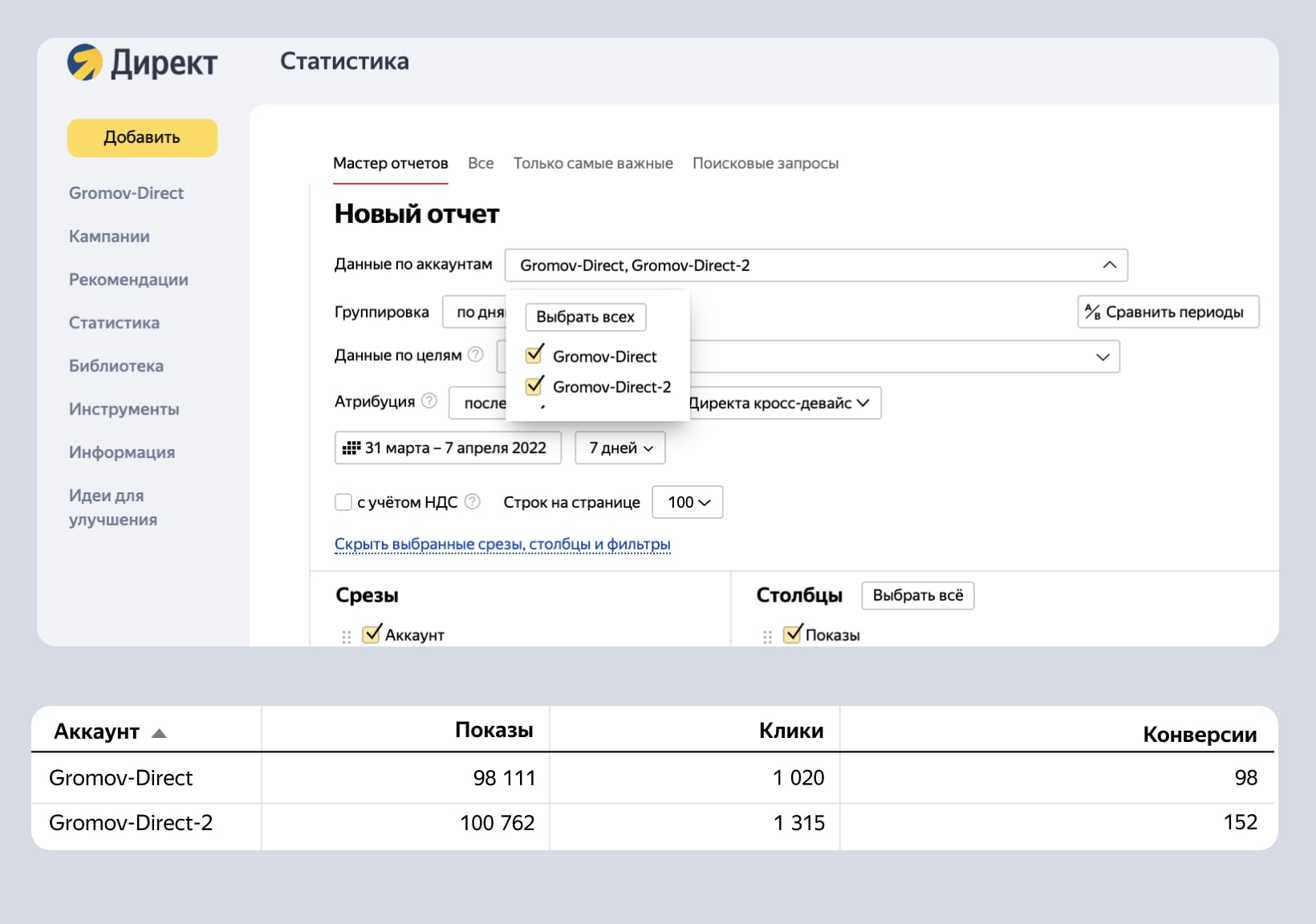Также управляющий может анализировать показатели доступных ему аккаунтов в Мастере отчетов и статистике по поисковым запросам. Чтобы изучать статистику в разрезе каждого аккаунта, используйте срез «Аккаунт».
