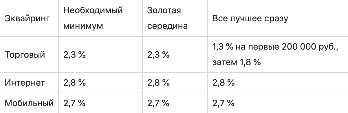 Для повышения мобильности и доступности бизнеса банк подключает эквайринг. Ставки за обслуживание зависят от выбранного тарифа: