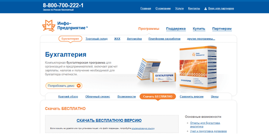 Данная программа для ведения бухгалтерии прекрасно подходит малому бизнесу (до ста сотрудников в штате). Лозунг разработчиков звучит довольно притягательно и наполнен оптимизмом: «Скачай и работай». Особенно приятно, что есть действительно бесплатная версия — не просто демо, а вполне работоспособный софт.