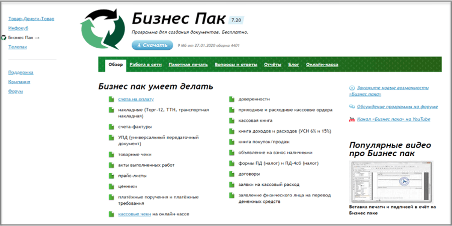 - позволяет формировать основные бухгалтерские документы — счета на оплату, счета-фактуры, акты, доверенности, приходные и расходные кассовые ордера;