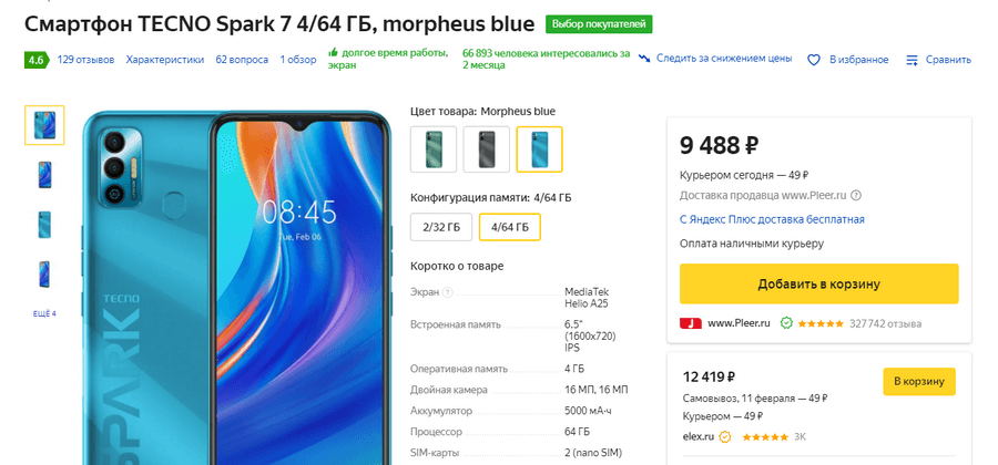 Восьмиядерный процессор Helio A25 (MediaTek), 2.0 ГГц обеспечит быструю загрузку приложений, плавную анимацию и хорошее качество снимков. Оперативная память — 4 ГБ, встроенная — 64 Гб. Можно добавить карту на 256 ГБ. Разрешение основной камеры — 16 МП, фронтальной — 8 МП.