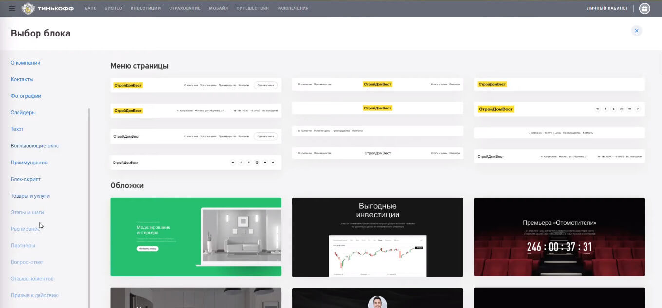 Т-Банк (Тинькофф) – это бесплатный и легкий конструктор от Тинькофф банка. Сделать на нем сайт могут только держатели карт этого банка. Можно сделать до 10 сайтов с неограниченным количеством страниц на каждом.