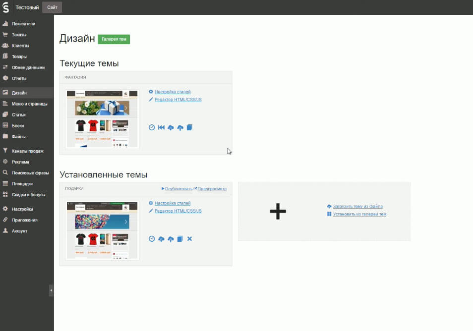 Редактор: внешне чем-то напоминает WordPress – слева панель админа, где отдельно ведется работа над каждым разделом – дизайном, контентом, настройками магазина, SEO и так далее. Но здесь мало возможностей кастомизации дизайна – то есть нельзя добавить какие-то блоки или виджеты, работать приходится в рамках выбранного шаблона.