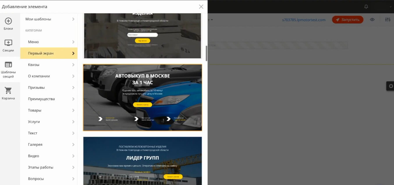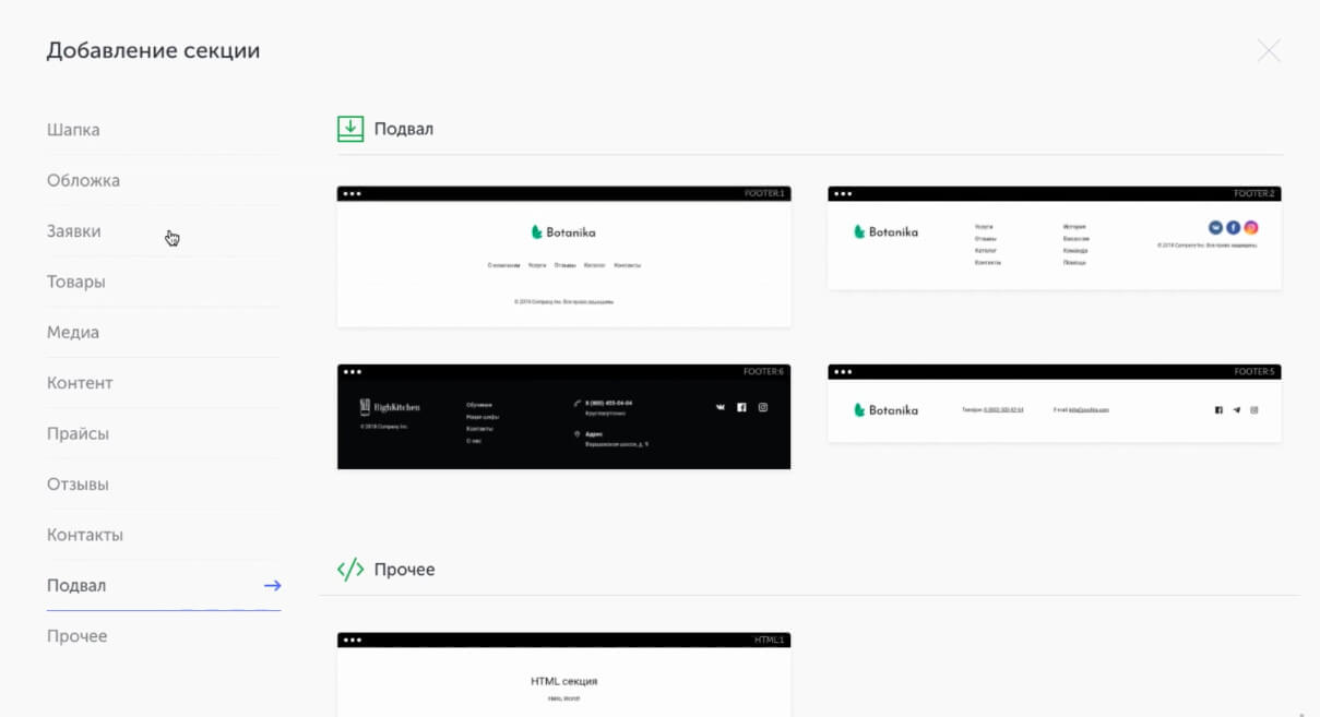 Редактор: ну очень сильно похож на Тинькофф – также выбираем готовые секции и меняем их. Секций много, возможности кастомизации широкие.