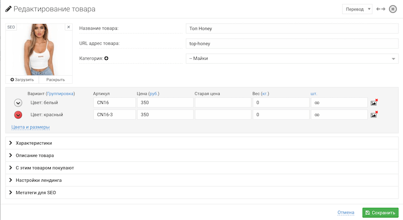 Редактор: создавать новые страницы и добавлять товары не сложнее, чем редактировать документ в Word. Достаточно добавить картинки, разместить текст и прописать базовые настройки страницы, в том числе касающиеся SEO-продвижения.