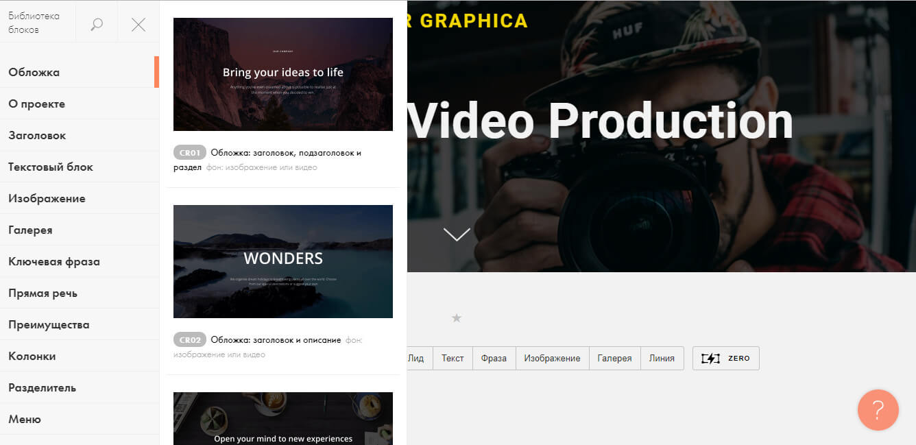 Тильда – это российский конструктор, позволяющий собирать впечатляющие лендинги и многостраничники из готовых блоков. Основной упор здесь сделан на дизайн и типографику – все это продумано за вас, поэтому можно сосредоточиться на создании контента и продвижении сайта.