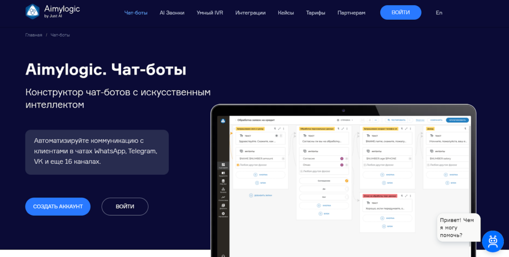 Aimylogic – конструктор чат-ботов на базе машинного обучения и искусственного интеллекта. Также в сервисе можно создавать сценарии для умных обзвонов, голосовых ботов и навыки для голосовых ассистентов.